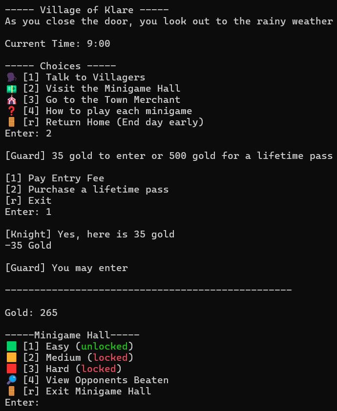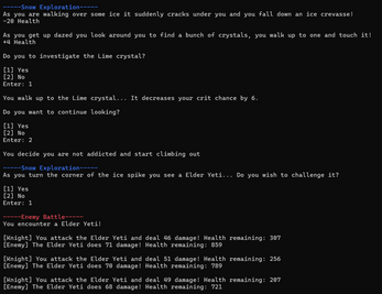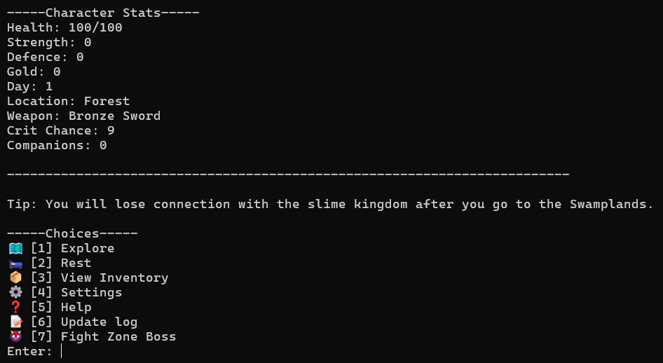 It’s a text-based RPG with exploration, turn-based combat, bosses, minigames, progression systems, and multiple zones. Everything runs in the terminal from an exe.